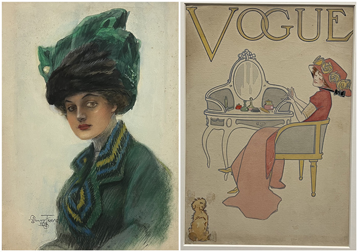左圖:綠衣女子像,斯圖爾特?特拉維斯(Stuart Travis,1868-1942,美國插畫家、平面設計師),1910;右圖:《Vogue》雜志封面插畫,1910