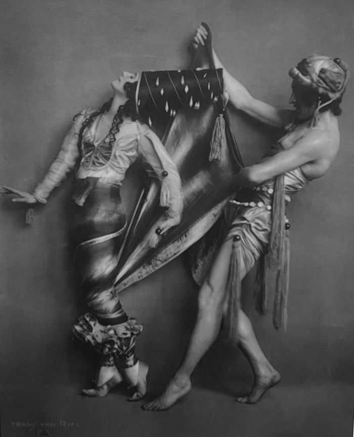敘利亞舞蹈中著中東服飾的安娜·巴甫洛娃(Anna Pavlowa,1881-1931)和休伯特·斯托維茨(Hubert Stowitts,1892-1953,美國畫家、芭蕾舞演員),攝/弗蘭斯·范里爾(Frans Van Riel,1879-1951,法國攝影師),1917