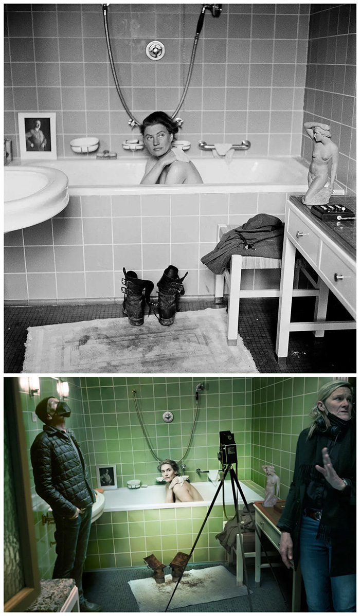 第二次世界大戰爆發后,身處倫敦的李·米勒拒絕了家人朋友勸她返回美國的請求,舉起相機為《Vogue》擔任戰地攝影師。1942年末,李·米勒被美國陸軍正式任命為康泰納仕出版集團的戰地記者,先后記錄下倫敦空襲、巴黎解放、恐怖的達豪納粹集中營等歷史場景。李·米勒是第一批進入希特勒在慕尼黑住處的人,并留有一組標志性浴室照。2024年即將上映一部全新的傳記電影《李》,李·米勒由凱特·溫絲萊特飾演,《Vogue》在對凱特·溫絲萊特的專訪中特意致敬了這張浴室照。