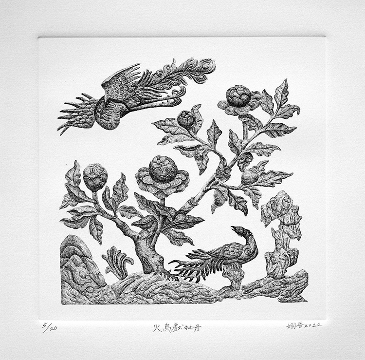 簡翊晉 《花園風景 火鳥戲牡丹》30x30cm 凹版、版畫紙 2022