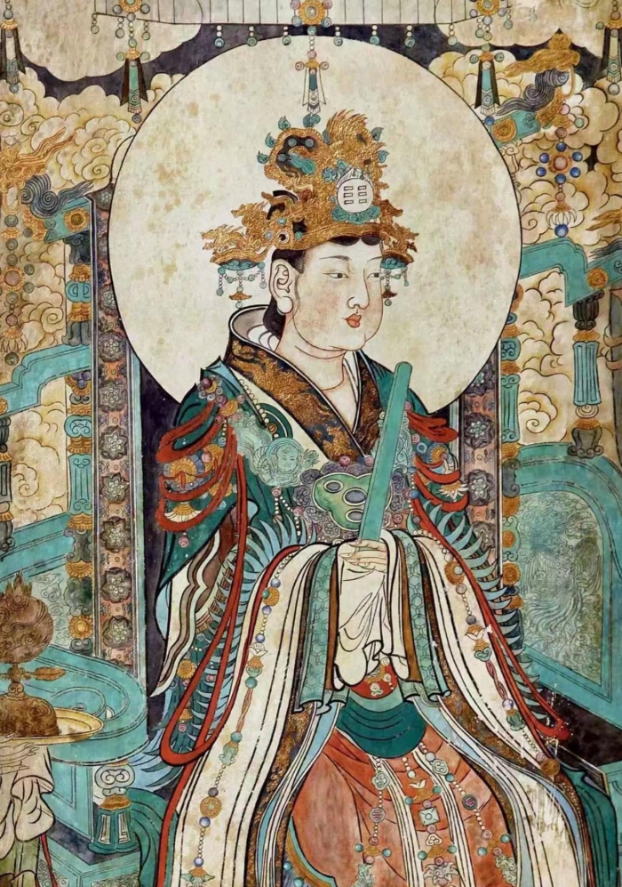 中國神話《山海經》中的西王母(也稱金母元君,王母娘娘)被認為是長生不老的象征,傳說中,她在瑤池掌管吃了能飛仙升天的仙桃。山西永樂宮《朝元圖》中,西王母神情安寧肅穆,儀態端莊優雅,頭戴嵌“三三”坤卦字形的風管,身披霞帔坐于鳳椅之上。畫面毫發畢現,彷佛能聽到胸前的瓔珞叮當作響,嗅到幾案之上的鮮花芬芳四溢。西王母是古人浪漫自由精神的形象寄托,代表著人對生命永恒的向往。