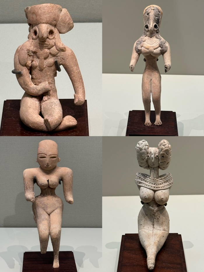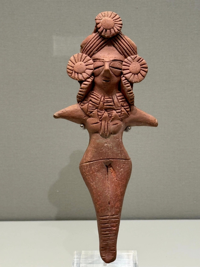 這座女神像的線條裝飾效果隨處可見——頭部周圍的三朵太陽花,豐盈的頭發,繁復的項鏈。盡管在這個時期,巴基斯坦、兩河流域和古希臘都存在類似的地母崇拜現象,但也不難看出,對美的向往也在宗教信仰和地區文化之外茁壯生長著。