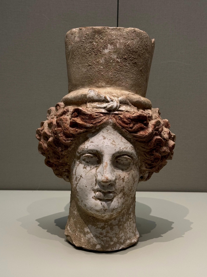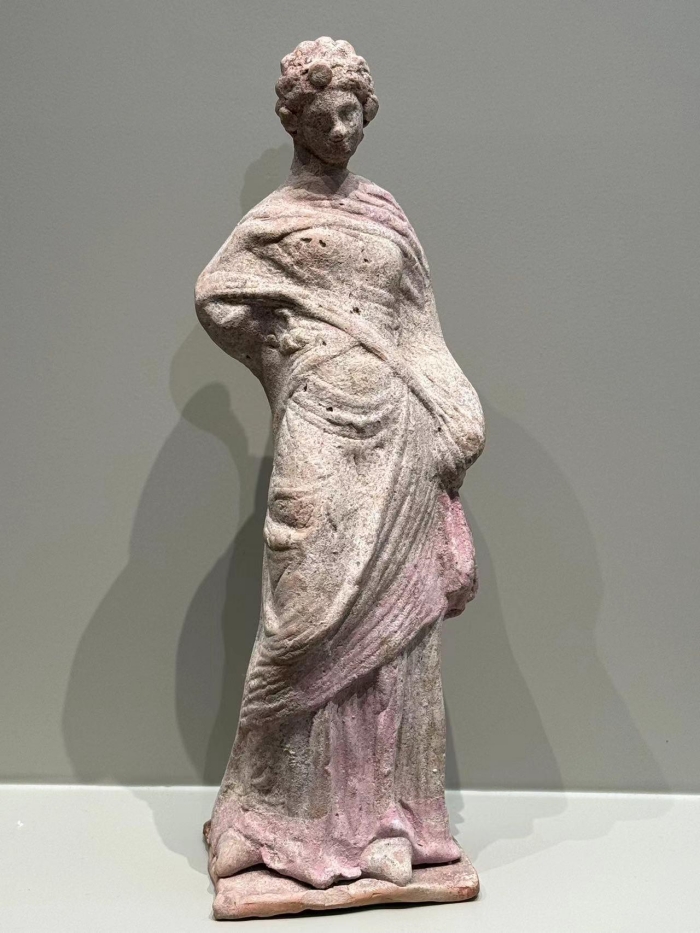 這類在當時備受喜愛的女性小像在埃及的亞歷山大港及希臘的塔納格拉(Tanagra)等多個地區大量生產,并作為陪葬品葬于墓中。理想化的希臘審美在這個小巧的雕像上得到體現,微卷的長發別致地盤在頭上,下頜微頷,身體向一側扭動,衣服的褶皺和色彩清晰可辨。