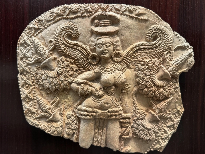 有翼女神像供奉板是由模具壓制而成的陶制供奉品,奉獻給在印度象征幸福與財富的吉祥天女拉克什米(Lakshmi)。有翼女神立于蓮花座上,眉間以白毫裝點,背景遍布植物及花紋,邊緣也以精巧的點和線進行裝飾。從中可以看到當時工匠們對精細且紛繁的工藝的掌握。