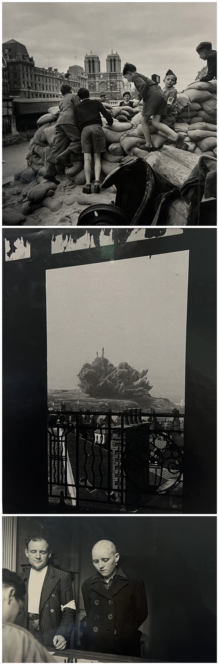 攝 /李·米勒(Lee Miller,1907-1977),1944,上圖:在巴黎圣母院的軍事路障前嬉鬧的孩子們;中圖:法國圣馬洛解放戰役中的爆炸;下圖:法國解放后,一位因戰時“通敵”而被剃掉頭發的法國女性正在接受審訊