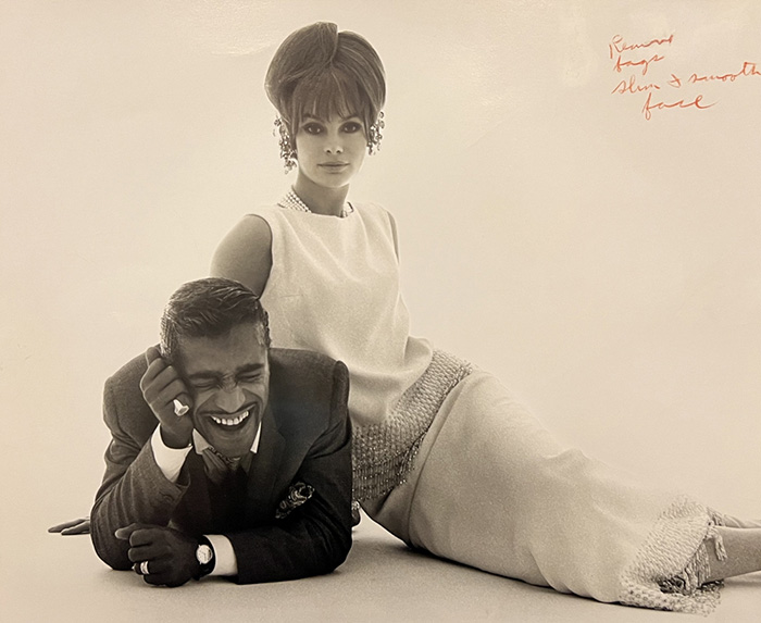 大衛·貝利“捧紅”過不少模特,最大牌的是英國超模及演員珍·詩琳普頓,她同樣是「搖擺六十年代」的當家面孔。下圖中與她同臺的是美國演員、音樂家和舞蹈家小薩米·戴維斯,戴維斯當年在美國大受歡迎,所產生的影響在一定程度上幫助緩解了娛樂圈因種族歧視而帶來的重重障礙。戴維斯于1960年代因在音樂劇《Golden Boy》中的出色表演獲得托尼獎提名,該劇也是百老匯首次出現跨種族吻戲的劇目。