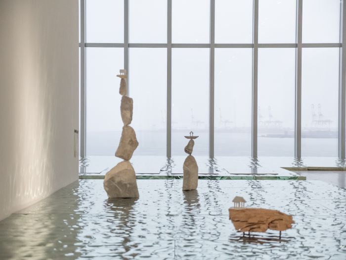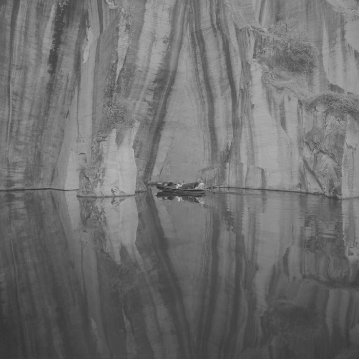 蔣斐然:策展團隊希望每件作品都能夠有所呼應,互相串連,在展覽現場形成連貫的敘述。盡管作品媒介形態各異,但相互呼應、對話,共同營造了一個相互貫通的現場。比如我們能看到其中一座仙山其實是一個洞天。在洞的入口處,一掛瀑布流下來。展陳方式借鑒了日式園林的造景手法,展出了林舒的攝影作品《鴆》,以黑色燈箱嵌入墻壁的展出方式,微弱的燈光打到作品上,影影綽綽能夠看到瀑布部分是光亮的,讓人仿佛置身于真實的洞天之中。而緊挨著這個洞口的,是另一個與該洞口完全等大的洞,只不過它是攝影作品——藝術家塔可的攝影作品《洞中觀音2》,拍攝內容是洞天中民間用石頭壘起來的觀音。這件作品不僅與林舒的洞天一左一右,有如一虛一實的兩個洞天相互呼應,同時也與洞外杉山功的《神居》系列雕塑作品構成形式上的互文,因為它們都同樣處理了堆疊石頭的作品形態。