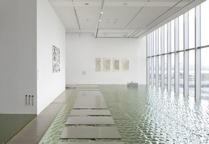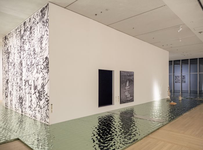 卓鶴君先生的作品《泉高入夢喧》在展廳中呈現為一件丈二的頂天立地畫作。我跟卓先生的家人講,作品不需要任何裝裱,就以大頭釘釘在展墻上,如一練瀑布飛流而下。這樣的展出方式,對于傳統書畫來講一定不是正常的展陳方式,但是我們邀請的藝術家們,在理解了整個展覽方案之后,都抱有非常開放的態度,愿意配合展覽的呈現。