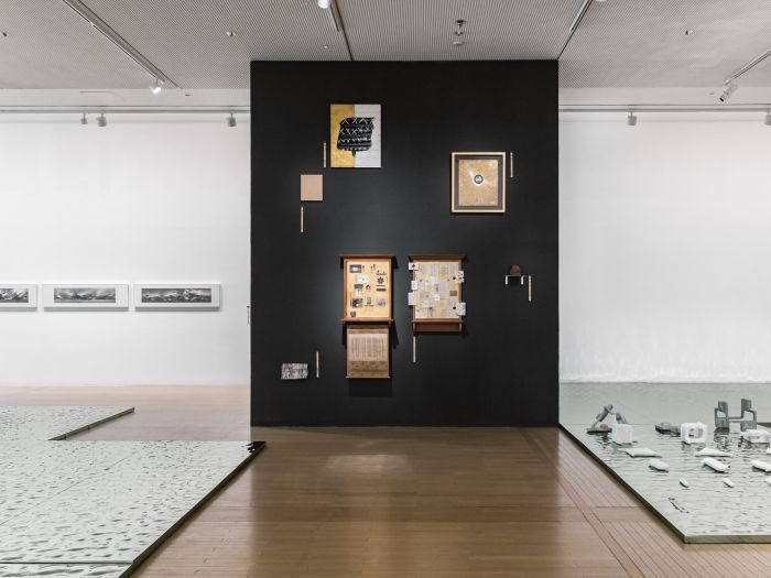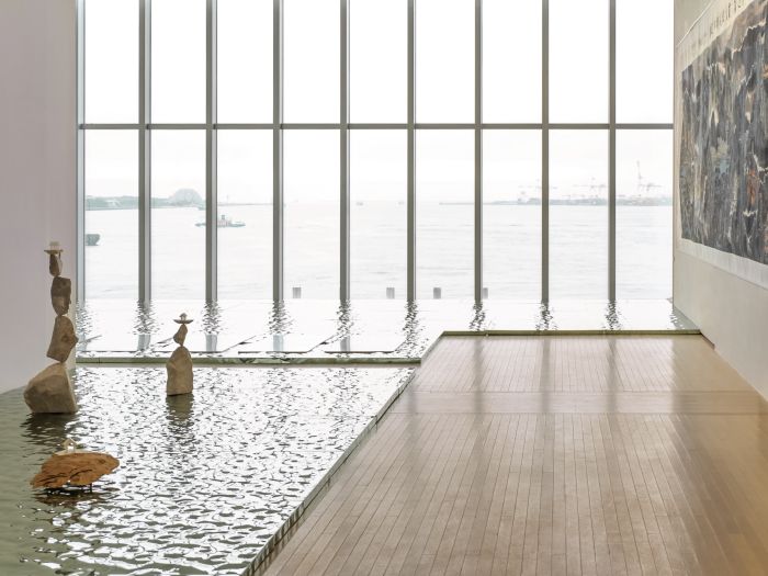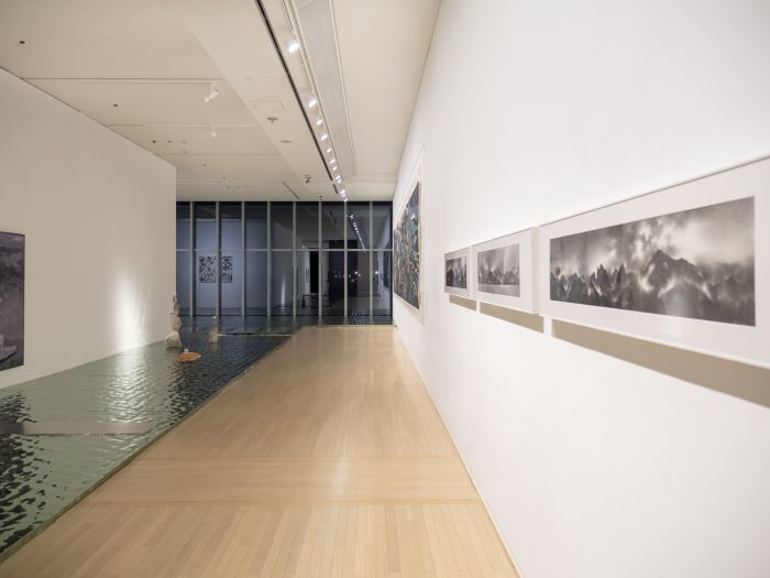 此外,展廳還做了三處墻體搭建,隱喻漂浮在“海面”之上的三座仙山;整個展覽現場構筑了“三山三境”的節奏,并綜合運用了光線營造了三種視覺意象:靠近海面的部分采用室外光,明亮寬闊,觀眾也會覺得心境開闊;中間部分則采用室內白光,形成三山合圍的對話;最后是一個內觀的區域,采用了暖色燈光,空間較暗,營造出一種關照內心的親密氛圍,引導觀眾進入內心深處的思考。展覽的節奏不僅實現了對“三山三境”的隱喻表達,更是拉出了中國傳統中國畫的三種視角——平遠、高遠、深遠。
