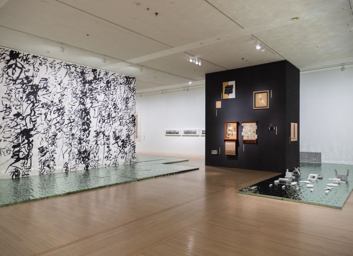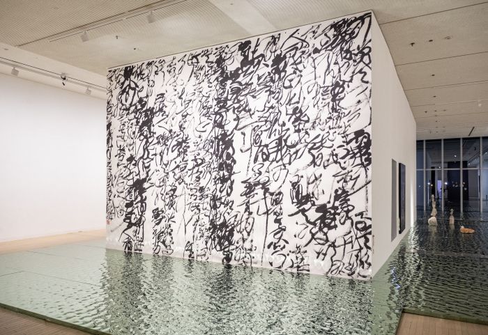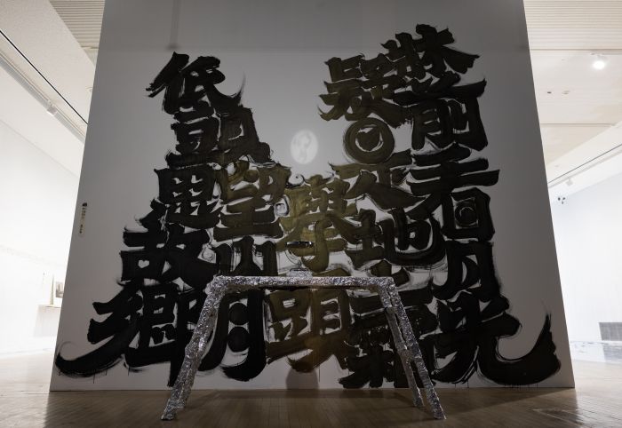 再比如,在正對著海面的白墻上,也就是整個展廳最開闊的一個位置,我們只展出了宇野雪村的一幅書法作品《白日依山》,內容寫的就是那首家喻戶曉的“白日依山盡,黃河入海流,欲窮千里目,更上一層樓”,尤其符合現場這個位置的開闊意境。而《白日依山》的前奏,則是一件長達13米的《唐詩之路圖》,是中國美術學院林海鐘師生團隊的集體創作,他們重走浙東唐詩之路,最終共同創作完成這件杰作。只有經過漫長的浙東唐詩之路的游歷,才能抵達海上之路的寬闊。在《白日依山》的旁邊,還展出了賴少其的四聯唐詩書法,賴少其曾赴大阪,與日友人共同協商中國書法家協會的創立,此番作品重回大阪,成為歷史和當下相互接連的見證和窗口。而《白日依山》相反的展廳的另一端,則是魯大東的現場創作《何時明月》,現場題壁日本版本的唐代李白《靜夜思》。這件《何時明月》與宇野雪村的《白日依山》在現場遙相呼應,他們都以不同于傳統書法的方式書寫,路徑又不通,在日與月、白晝與夜晚形成了有趣的呼應。
