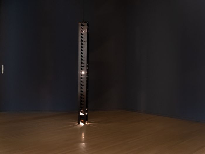 再舉一例,“塔”是在展廳中反復出現的視覺意象。比如在展廳的最后一個區域,一座仙山內部展出了管懷賓老師的影像作品《流隙》,影像內容是一座塔在水中慢慢消融的過程,極具禪宗意味。而與這件作品形成互補與對話關系的,是梁琛的《無止境塔》?!稛o止境塔》是一件新媒體燈光裝置,這座塔不斷螺旋式滾動、上升,指向的或許是一種當代的巴別塔,隱喻人類永遠向上求索,生生不息,向宇宙探尋的欲望;塔內的燈光照射到墻壁上,令人想到柏拉圖的洞穴隱喻,映照出幻象的現實。梁琛的“塔”突破了我們對佛塔的傳統意象,塔作為一種精神象征物,也代表著人類探索宇宙的野心,古代的人們望塔通天,今天的我們依然在通天的道路上沒有停止過。這件不同形式的塔,無論是在媒介含義還是在精神內涵上,都給展覽疊加了另一個維度的解讀。