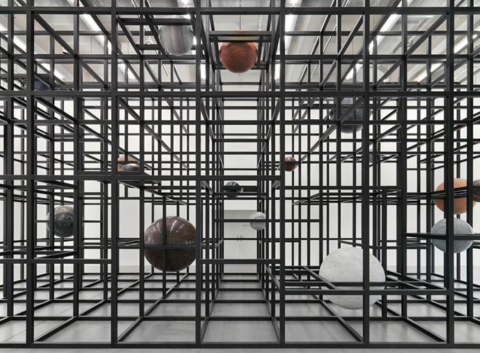 如果說亞歷山大·考爾德的作品打破固守的空間準則,從而賦予了雕塑動態的美感,那么阿莉恰·克瓦德(Alicja Kwade)則重新以簡約且概念化的金屬線條將碩大的大理石球懸置空中,再現了現代社會隱秘且脆弱的一面。