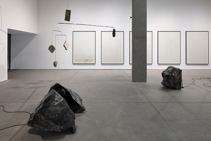 在個展《Silent Matter》中,克瓦德就利用哲學和自然現象來探索人類狀況。她借助思維實驗這一科學和哲學中常用的工具,探討難以解釋或幾乎不可能解釋的概念和現象。展出的系列作品覆蓋了從宇宙無邊無際的擴展到極微小的亞原子領域。通過對歷史上重要的黑曜石的癡迷,克瓦德利用這種具有反光性質的火山巖石,與臺燈相結合,營造出被太空黑洞包圍的星體光輝圖景。她試圖將柏拉圖的“洞穴寓言”和量子物理學的觀念具象化,通過物理形態的實驗來激發討論并質疑人們理解甚至控制現實的能力邊界,從而在一種超越日常感知的寧靜和深邃體驗中,獲得對宇宙根本法則的思考與啟發。