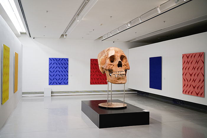 王旭 《大頭骨在滿是一年級學生的F109教室》 2008年 尺寸可變 樹脂、金屬、油性漆