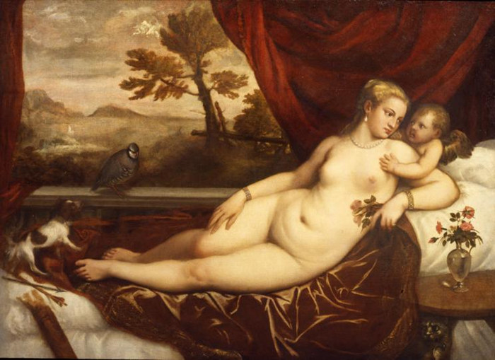 提香與其工作室共同完成的《維納斯、丘比特、狗與山鶉》,這幅創作中期的作品,可以看到與其早期作品《花神》在風格、筆法上的變化。創作于早期的《花神》筆法細膩,后期的《維納斯、丘比特、狗與山鶉》不拘泥于處處細膩地刻畫,筆觸更為清晰。斜躺的維納斯手握鮮花,丘比特將手搭放在維納斯的胸前。維納斯的腳邊有一只狗、窗邊站立著一只山鶉,半拉開的絲絨窗簾將觀者的視線引向室外的自然風光。同樣的題材與相似的構圖,提香畫過多幅作品。大約創作于1538年的《烏爾比諾的維納斯》,提香直接“挪用”與老師喬爾喬內共同完成的《沉睡的維納斯》的構圖,但提香將維納斯的形象世俗化了,斜躺的維納斯將目光對準觀眾。喬爾喬內筆下恬靜、詩意、沉睡的女神形象,在提香后來的演繹中更多了世俗、情色的現實女性形象的意味。提香在背景中增添了狗、女仆、小孩的生活場景。