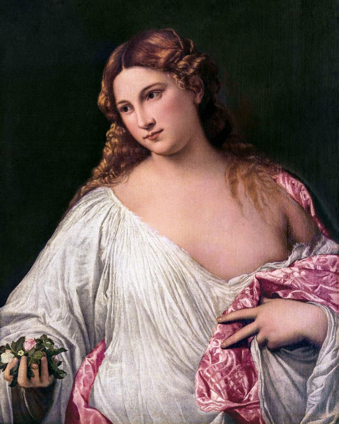 提香對女性形象理想化的處理使得女性畫像在威尼斯乃至整個歐洲獲得了前所未有的重要位置。創作于1517年的《花神》足以窺見提香對女性肌膚精妙入微的細致描繪,春之女神——花神芙洛拉眼神望向她的右側,右手手握鮮花,左手扶著半耷下來的粉色織錦外衣?;ㄉ竦募∧w被細膩的筆觸描繪的一絲不茍,臉部的五官塑造出深邃的立體感。提香所描繪的這一威尼斯美人的形象是在現實中并不存在的理想化女性?;ㄉ褴铰謇m以性感的半身像呈現,但在這里并無象征誘惑的寓意,而是暗示與訂婚和結婚儀式相關。