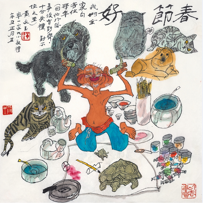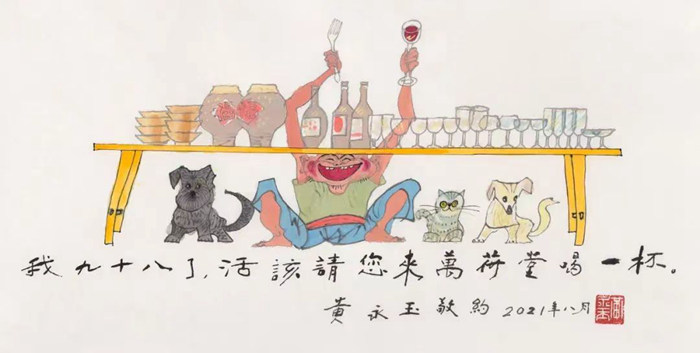 在黃老上百張的作品中,極具黃氏特色的“邀請函”格外引人注意,這其中有生日卡也有中秋佳節的約飯邀請。黃老每年的生日都很熱鬧,不僅請來朋友們歡聚,好酒好菜,伴隨著抽獎,更重要的是每年都會有一件作品應運而生,即專為自己生日邀請賓客而創作的請柬。98歲的生日卡中老者張開雙手高舉酒杯,雙腳呈大字型張開,咧著嘴巴仰天大笑,發出共飲的邀約:“我九十八了,活該請您來萬荷堂喝一杯”,長長的桌案上放滿了酒杯,家中的貓兒、狗兒也圍坐一排,與主人共同期待朋友的到來。