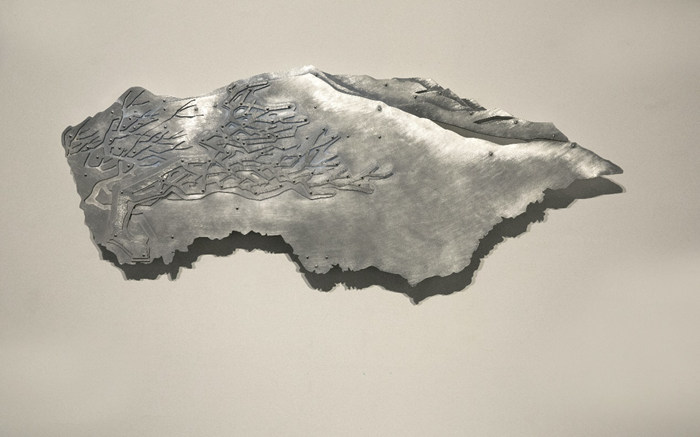 楊冬白1959年生于上海,1997年日本東京藝術大學雕塑系本科畢業,本次展出《遠山微風》等10件/組作品。藝術家以不銹鋼材質創造山水,硬的材質和軟的意象形成巧妙的對比。金屬雕塑產生的視覺膨脹效果讓作品在上墻后更凸顯輕盈的質感。銀色且富有流動性的表面產生水波蕩漾的視覺效果。他的作品引發觀者關于雕塑材質和樣式的思考。