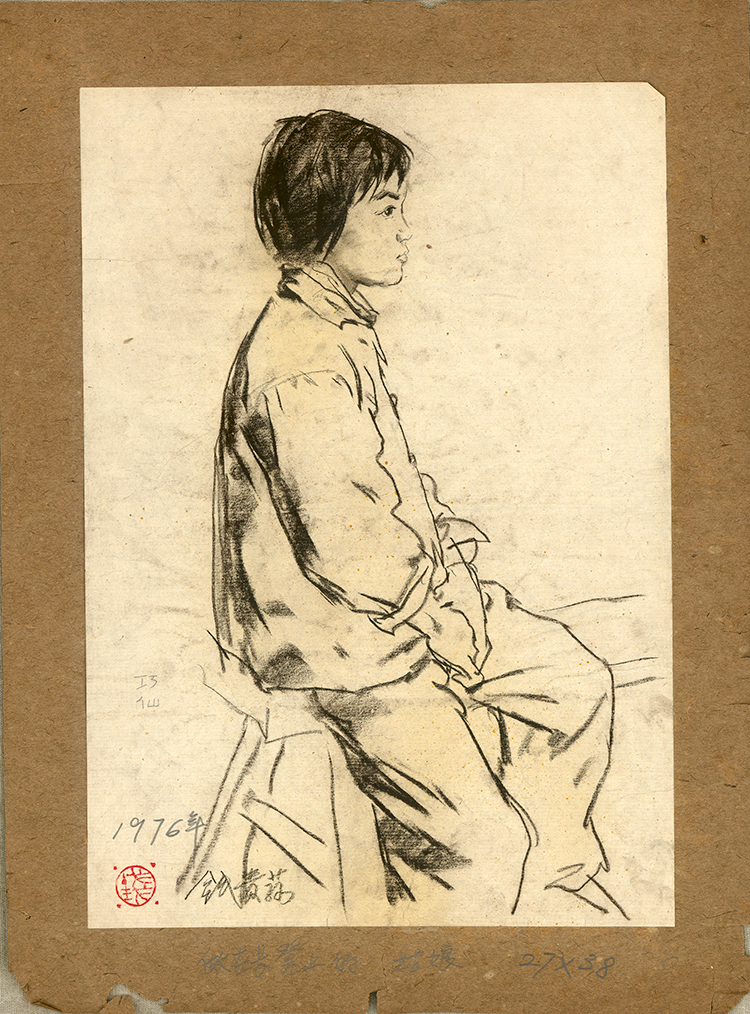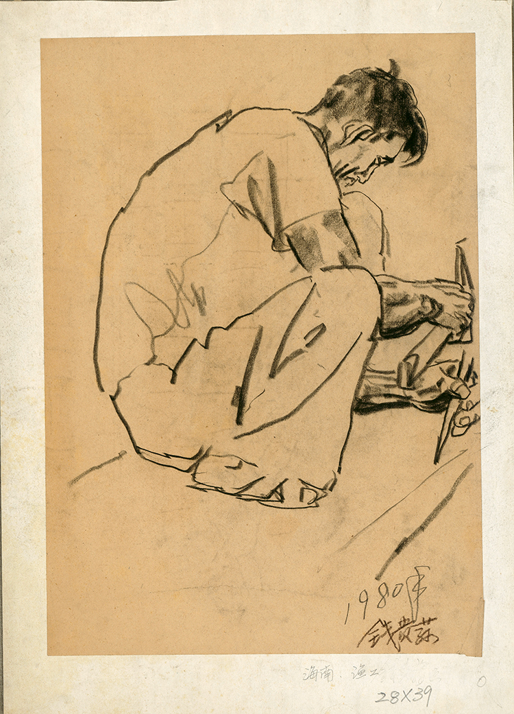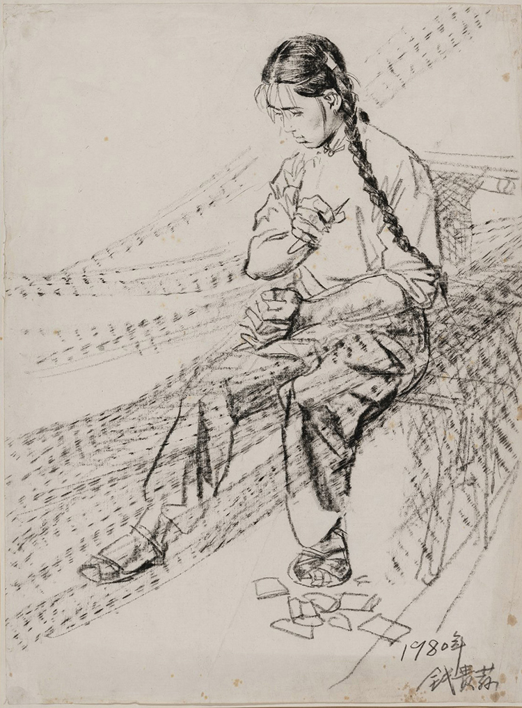 錢貴蓀 補網女孩 紙本 炭筆 48cm×36cm 1980 浙江美術館藏