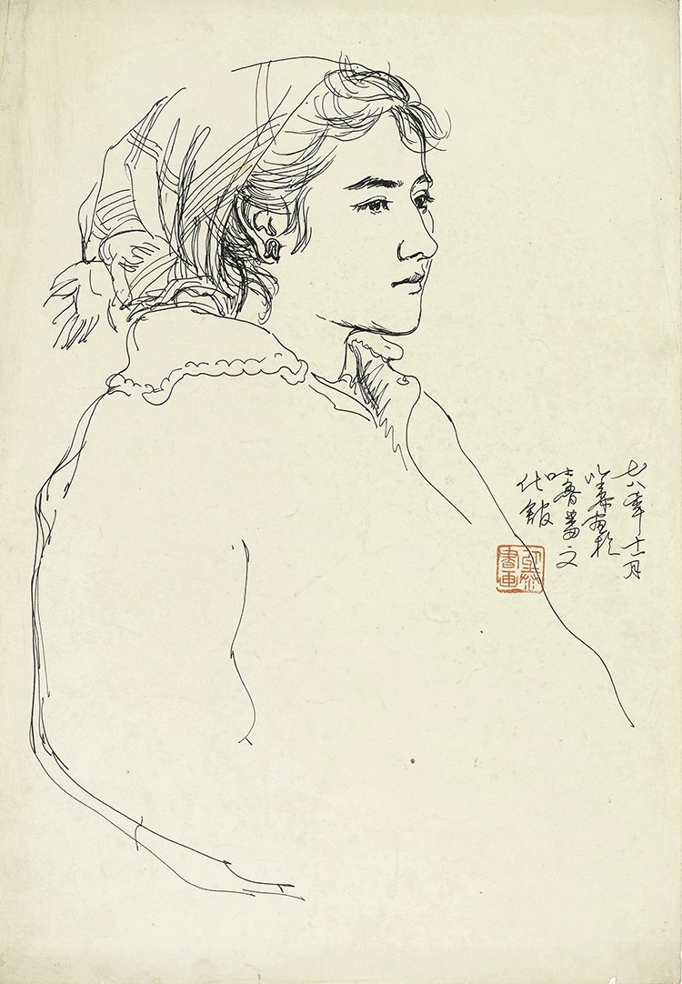美麗的維吾爾族姑娘 李以泰 40cm×27.5cm 紙本·鋼筆 1978 浙江美術館藏