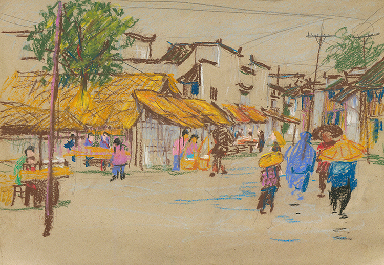 雨中街市 宋秉恒 27cm×39.2cm 紙本·油畫棒 年代不詳 浙江美術館藏