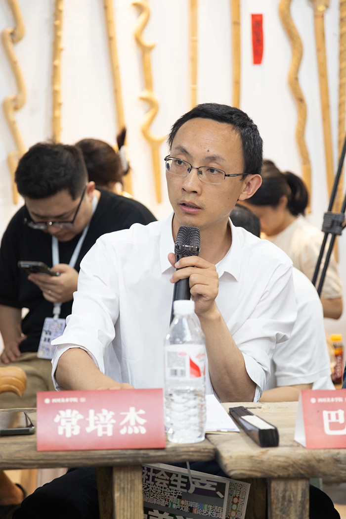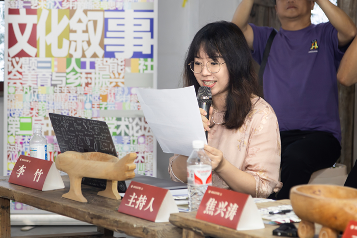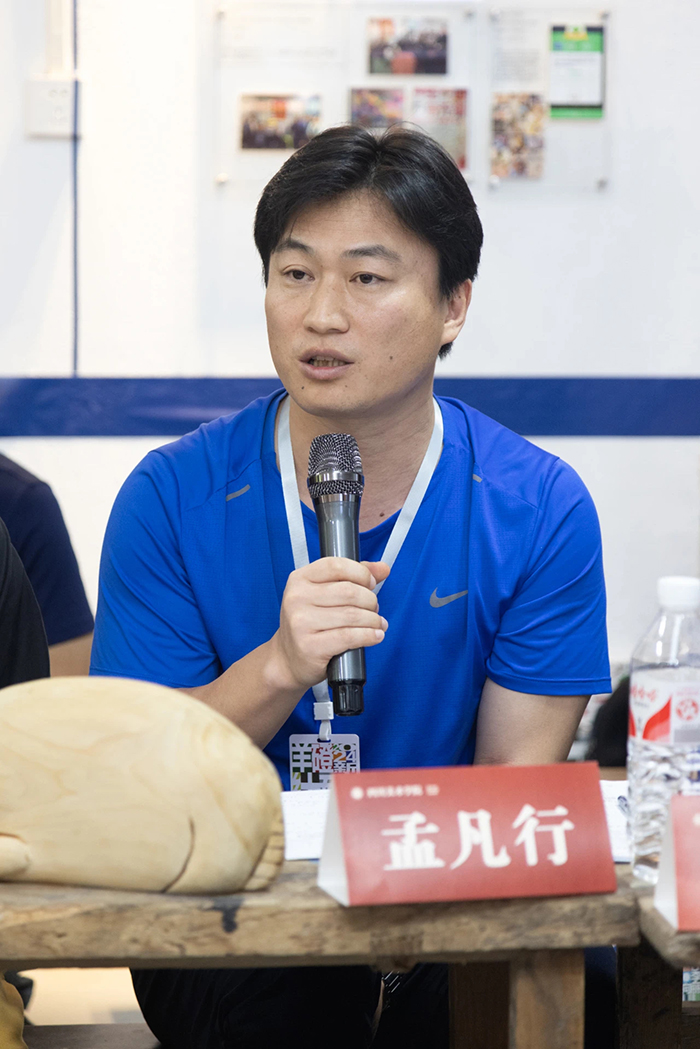 王志亮以《從羊磴鎮到五洲小區:從鄉村參與到社區參與的場景轉換》為主題進行演講,從2015年接觸羊磴鎮,講述了其發展變化,包括空間變大、參與者從找藝人變為找老藝人,并認為這兩個變化是羊磴鎮項目能持續的關鍵,即要有實在的空間和盡可能多的居民參與。其次提到在四川美術學院羊磴項目后形成以鄉村為先導、以社區為擴展的兩條線路。接著他展示了自己在社區開展藝術活動的計劃和成果,如在重慶五洲小區利用廢舊物品進行創作、駐留剪紙藝人的定制剪紙等。最后他認為羊磴鎮的經驗可以推廣,在這一過程中藝術也從啟蒙的主導者變為弱介入者,用精神性的形式俯身大地,關切國家實際利益。