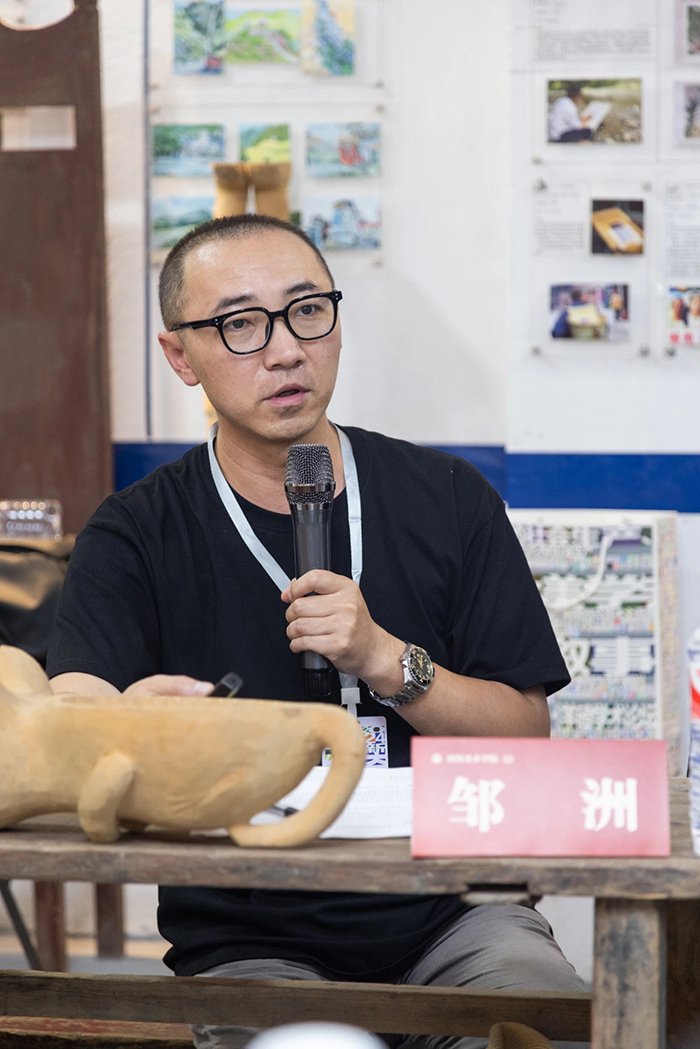 鄒洲以《連接——藝術介入鄉村的路徑與思考》為題目進行發言,在演講伊始,他推薦了三本有關生態和田園主義的書籍——《塞耳彭自然史》、《明日的田園城市》和《瓦爾登湖》。他回顧了中國近代以來鄉村建設的歷程,表達出對鄉村建設工作的思考和實踐。他指出當前鄉村發展的城鎮化和旅游開發兩種常見模式存在的問題,如缺乏特色、產業支撐不足、交通不便等。新農村建設應從根本上改變農村傳統經濟結構,強調觀念變革,把農村作為整體化的生命沉淀考慮,把農業作為文化藝術的重要抓手。在云南的調研中,鄒洲的團隊對精神文化相關的手法、儀式、通靈、藝術發生進行研究后,重塑了當地地方空間,對社會轉型中的社會創新和設計轉型做出更全面的展示。最后鄒洲在藝術鄉建的相關矛盾問題中認為,鄉村與城市是二元化人類社會的一種生態,與藝術審美的范疇無關;藝術鄉建是以藝術為載體,修復鄉村的相關精神,創造新的文明習慣。