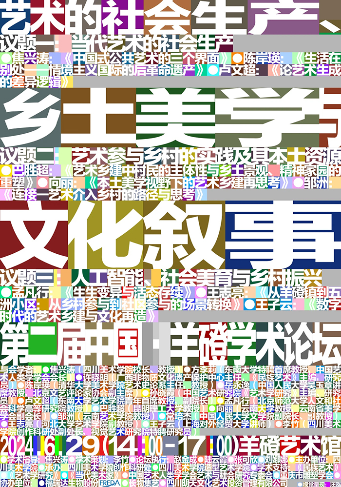 2024年6月29日下午,由四川美術學院主辦,四川美術學院創作科研處副處長李竹擔任學術策劃的第二屆中國羊磴·學術論壇在羊磴藝術館成功舉辦,活動邀請了羊磴鎮居民、四川美術學院師生及當地藝術家共同參與,15位來自全國的藝術領域多方面專家學者圍繞主題“藝術的社會生產、鄉土美學與文化敘事”,分三個議題展開探討,為鄉村特色藝術教育課程建設與人才培養提供了寶貴建議。