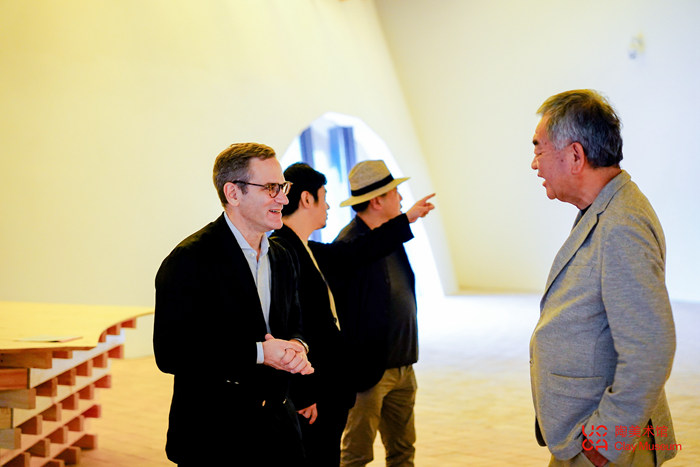 UCCA館長田霏宇(左一)和建筑師隈研吾(右一)在UCCA陶美術館建筑空間內