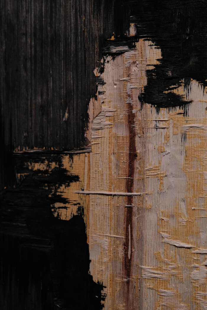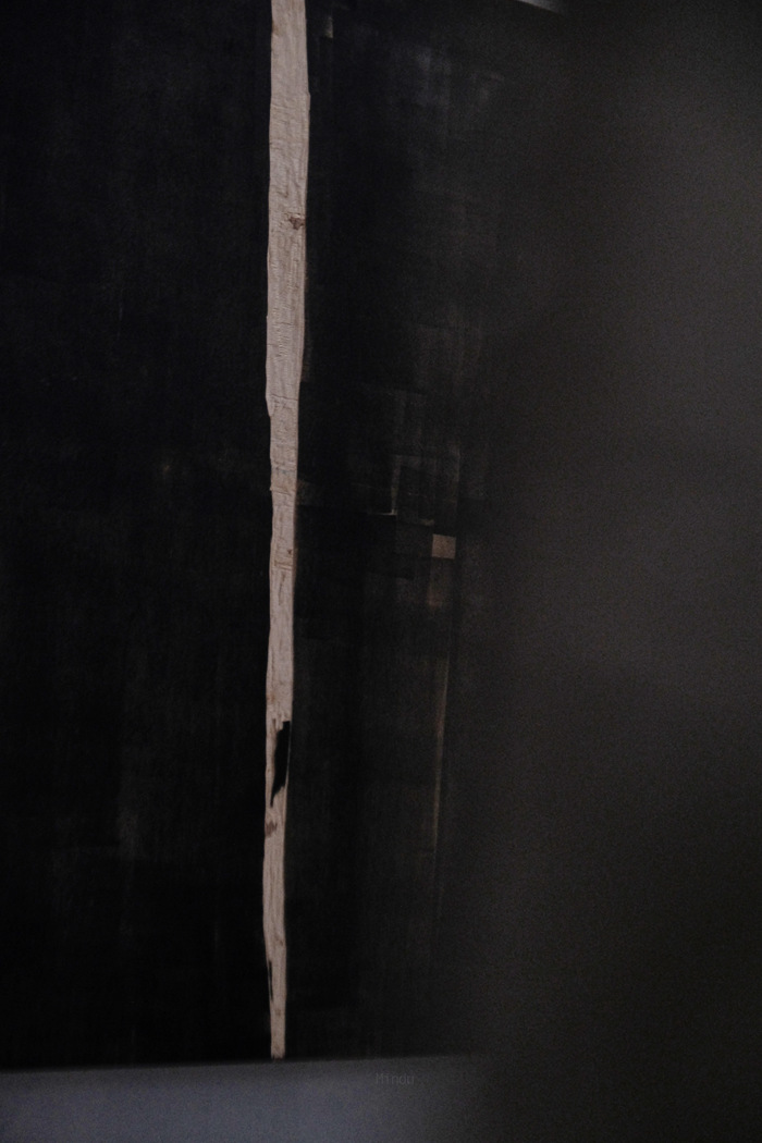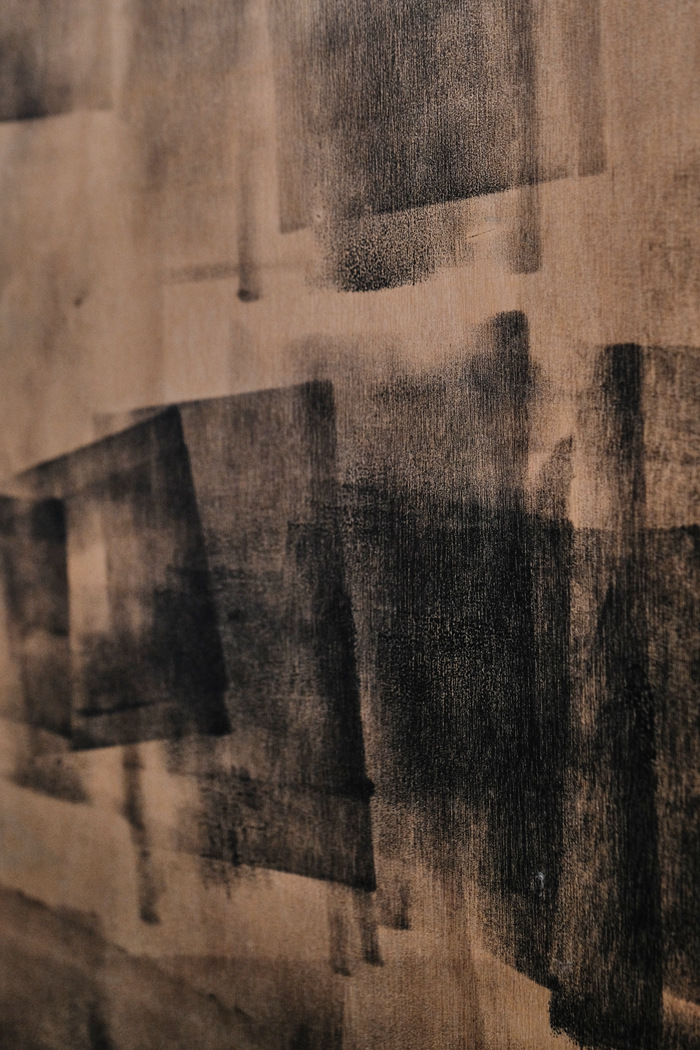 王綺彪改變了油墨和木板的傳統功能,在他這里,油墨成了他的“板象藝術”唯一使用的“色彩”,他將沾滿油墨的滾軸變成沾滿“色彩”的“畫筆”,在木質板材表面滾動。一方面,手臂不同的壓力和滾軸的快慢形成了墨色隨機的深淺濃淡變化,使油墨在板材上呈現出水墨大寫意神韻,卻又極富油畫般的厚重感和塑造性;另一方面,他通過油墨滲向木紋肌理產生的板材纖維筋絡的僨張,以及板材自身豐富錯落的天然木色,共同形成酷似中國古代帛畫的面貌,產生深沉感和神秘性,距離感和深邃性,營造出一種陌生又熟悉的奇異空間。這個奇異空間里,王綺彪一刀未動,傳統木刻版畫的命脈:刀法,在此消失殆盡,繼之而來的,是王綺彪的“墨·板”世界的誕生。