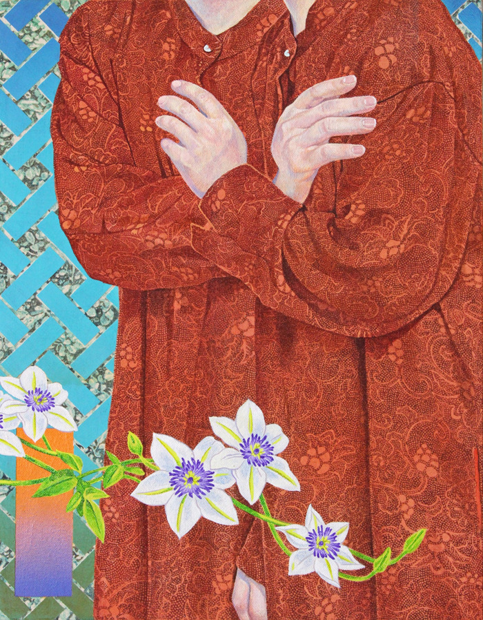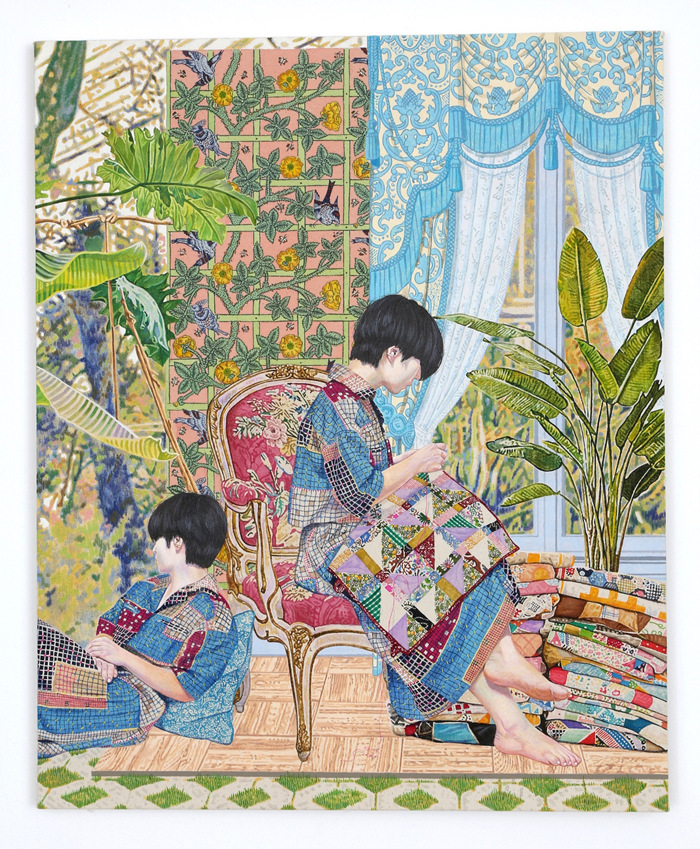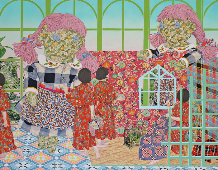 大久保如彌:在這幅作品中,象征母親形象的娃娃"小媽媽"的體型被放大了。這很明確地代表了母親在家庭中的重要影響,同時也是控制的象征。大娃娃被描繪成試圖控制我的形象。在畫中,我的另一幅自畫像只是在縫紉什么東西,右邊走出畫外的人則試圖擺脫某種束縛。與其說我的作品是在敘事,不如說我的作品是由象征性的圖案組成的,這些圖案通常是看似生動美麗的物體,卻暗藏玄機。植物園的背景代表了一種"舒適、安全"的環境,這是我母親反復告訴我的。瓷磚、地板、窗框等重復出現的網格圖案則傳達出一種封閉的壓迫感。我在這個想象的空間中加入了小型的沃德箱,從而創造出這些分層或嵌套的結構,以強調這種被困的感覺。