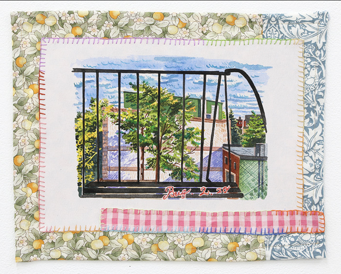 大久保如彌: 2021年,我創作了一系列題為“一天”的繪畫作品,作品下方縫制了圖案布料作為框架。這是我第一次在作品中使用布料。同年,我開始為畫中的自畫像制作自己的衣服。使用織物的這個轉折點發生在疫情期間。居家令停止了所有社交活動,迫使我進行反思,我意識到縫紉對我從小到大的重要性,它自然而然地成為了我那段時間創作的一部分。制作“一天”系列的動機是記錄我在疫情期間某一天的回憶。在這個系列中,我從用 iPhone隨手拍下的照片中選擇了一些圖案。這是我在布魯克林的公寓里看到的景色。我洗了衣服以后,把它們掛在窗外。我想把這些照片作為圖畫保存下來。