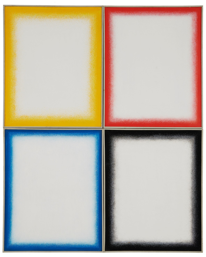 在杰羅夫斯基的觀念中,空意味著一切。作品《Obraz CDXXXIII a-d》是一副由四個等大的長方形色塊構成的作品,藝術家用紅色、黃色、藍色、黑色繪制四個封閉的方框,通過飽和的色彩使四個方框與外界清晰地隔離開來,同時用點狀的筆觸向長方形內部做漸變的模糊化處理。杰羅夫斯基把白色視為主體,視為光,他以非常少的介入和干預就能完成一幅強有力的畫。對杰羅夫斯基而言,形狀各異的線條有很多繪制方法,它們將由無窮個空間構成的世界進一步劃分成更為無限的空間。