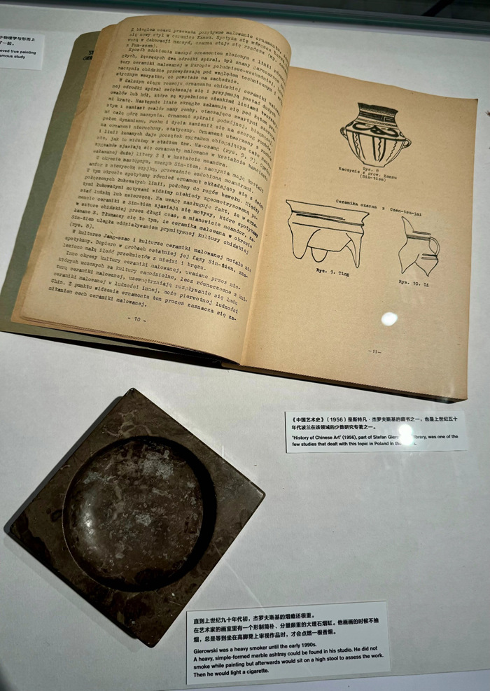 在這些個人物品中,一本1956年出版的《中國藝術史》展示了杰羅夫斯基在藝術生涯早期就開始了對中國藝術的深度關注。從書中,我們能看到中國古代陶器的的紋飾圖樣,和三足陶器的形態簡圖。杰羅夫斯基是在當時的波蘭對該領域的少數研究專家之一。杰羅夫斯基曾說:“中國畫確認了繪畫最重要的使命在于傳達思想?!睆臒o意識地產生情感,到在頭腦中定格成某種思考,人們無法用語言準確表達的觀念,在繪畫中得以體現。正如哲學家維特根施坦(Wittgenstein)所言,“有些事實無法形諸語言,但卻可以被看到或展示?!?/p>
