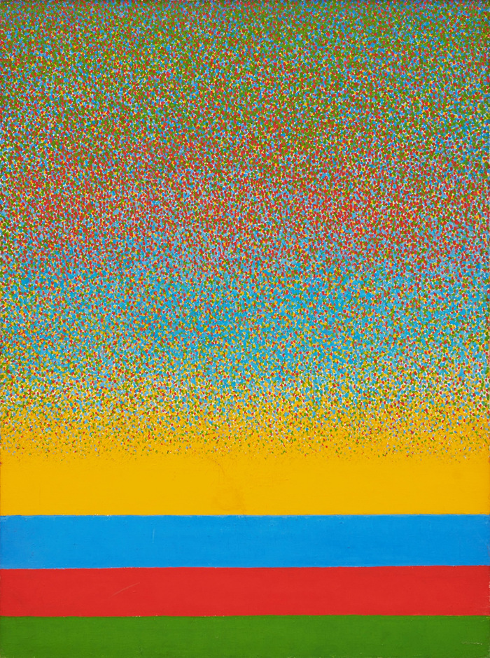 杰羅夫斯基是一位“點”的實驗家。他經常在畫中使用點,這不但確保了每種顏色都有自己的位置和空間,也在抽象藝術簡潔的初始訴求基礎上增添了更活潑的調性。這些“點”有時共同構成視覺中心,有時成為色塊間的過渡,也有時作為空間的區隔,它們最終的呈現方式會影響整個畫布。藝術家借由“點”的處理,探索光和顏色如何影響其他顏色,尤其關注白色是如何在其中發生作用的。在杰羅夫斯基對于“點”元素的嘗試和呈現上,觀者也得以借此思考繪畫的基本構成,看到“點”如何形成顏色,區隔空間,進而塑造一幅畫面。