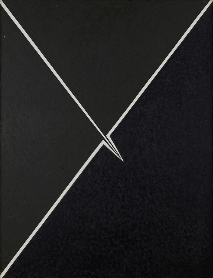 作品《olej plotno》由兩根白色的線條切割為三塊閉合的空間??臻g之間由不同質感的黑色筆觸填充,這導致了斜線兩側視覺效果的微妙差異。這幅作品再次導向了多元的解讀方式——物理的線條,或是宇宙飛船的軌跡,又或是象征著每個人變成更好的自我,也可能是肉體和精神的結合。與杰羅夫斯基以字母編號命名系統相類似的,不設置作品的準確解讀方向,是杰羅夫斯基希望觀者以思考參與欣賞的又一次嘗試。
