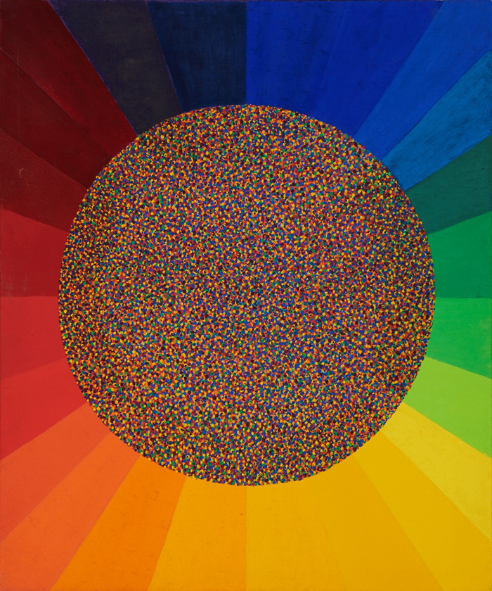 杰羅夫斯基有兩個物理學問題從未得到他滿意的答案:“什么是電流?”和“為什么彩虹是圓的?”而繪畫似乎成為了他向自己發出理性問題,并試圖做出感性回答的對象。在他的作品中,我們看到構成彩虹的高飽和度色彩——紅色、綠色、藍色、黃色,以邊框、方塊、長條、半圓形或是點狀的方式呈現,仿佛在尋找著彩虹除去圓形的各種可能性。杰羅夫斯基用明朗卻不失幽默的舉例和觀眾對話,思維嚴謹的同時,卻也讓真切的感知參與其中。