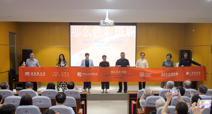 “新作展”巡展啟動儀式合影,從左至右:湖南美術館館長田紹登、成都市美術館副館長肖飛舸、揚州中國大運河博物館副館長陳晶晶、家屬代表黃黑妮、北京畫院美術館負責人薛良、上海世博會博物館館長劉文濤、蘇州博物館副館長茅艷、廣東美術館館長王紹強
