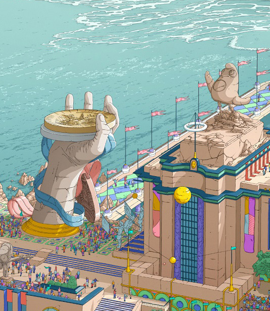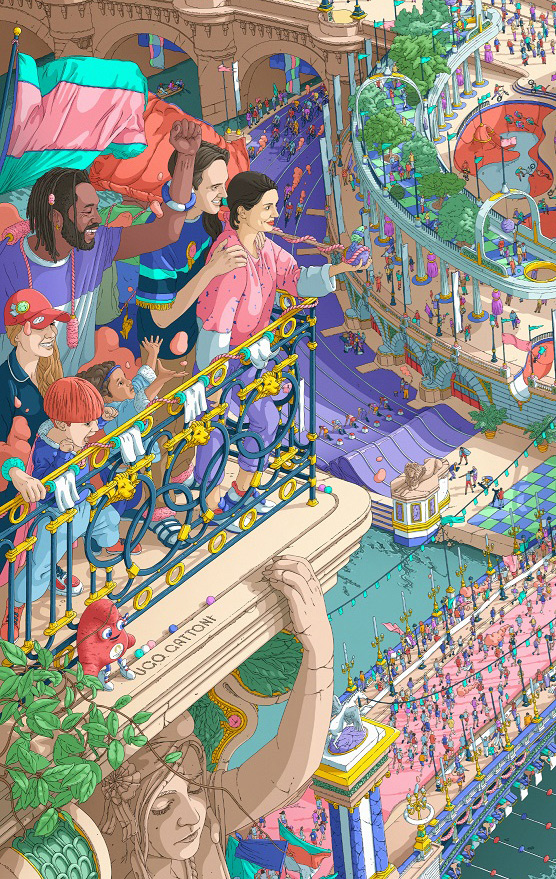 在今天設計和插畫領域被人工智能插畫和其他“高效生產”占據的背景下,烏戈?加托尼堅持用數碼筆手工完成。他說:“這需要時間。制作一幅精美的手繪作品很復雜。因此,我接受那些允許我花時間在藝術上,并尊重我的手藝的品牌的機構合作,而且我不會在品牌合作中保留我的個人風格。我很幸運能夠隨心所欲地繪畫?!?/p>