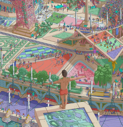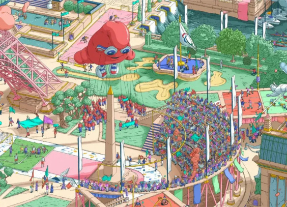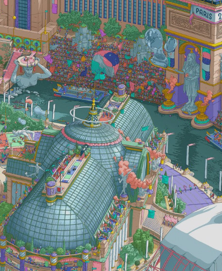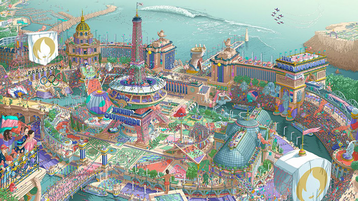 在這幅2024巴黎奧運超現實主義的“清明上河圖”中,藝術家跨越古今時空,巧妙地將奧運體育元素拼貼融合在巴黎豐富的文化敘事中,為全世界觀眾呈現出了一個奇幻的巴黎奧運體育場圖景。