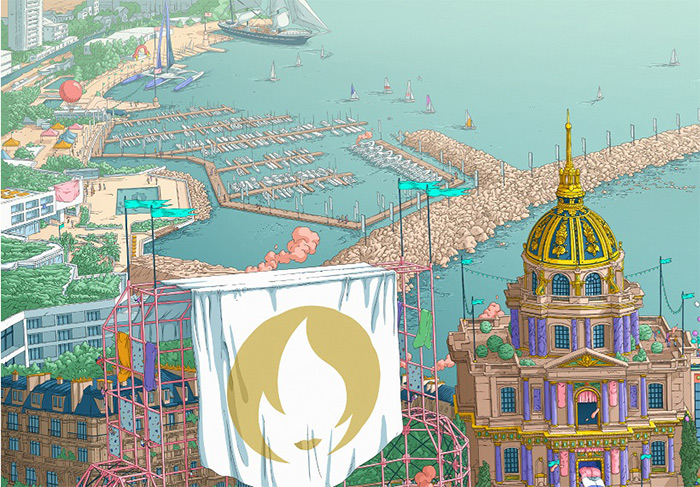 烏戈?加托尼得到了巴黎奧運會設計總監 JOACHIM RONCIN的高度信任,擁有完全的創作自由。在遵循簡要說明并尊重奧運會外觀的同時,加托尼仍設法保持自己俏皮、愉悅的繪畫風格。事實上,無論觀眾年齡多大都能從這幅藝術作品中得到一些樂趣。