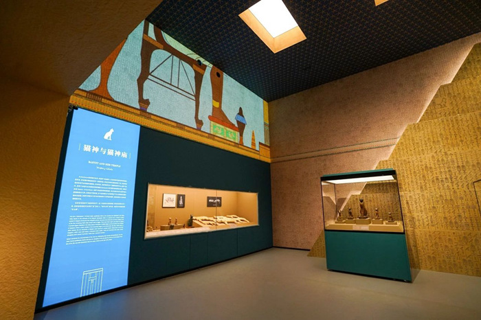 本展廳將“青少年友好”納入設計原則,降低展柜和陳列帶的高度,設計可觸摸的文物模型,動態演繹貓神的一體雙面,并營造一處蒙太奇的貓神圣殿,以期通過虛實結合的場景引發觀眾遐想。