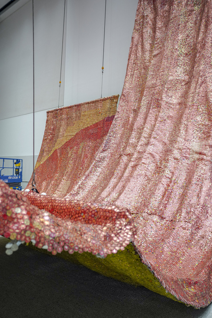 展覽不僅將重塑浦東美術館獨一無二的展覽空間——中央展廳,同時也將首次運用入口的大廳空間。兩個空間相互呼應,這件異常宏偉的作品將為觀眾帶來一場前所未有的觀展體驗。整個裝置由成千上萬被重新利用的瓶蓋和金屬碎片構成。它們經過手工揉捏、碾壓,并用銅線巧妙串聯,形成兼具靈活性和適應性的獨特組合,帶來巨大的視覺沖擊。
