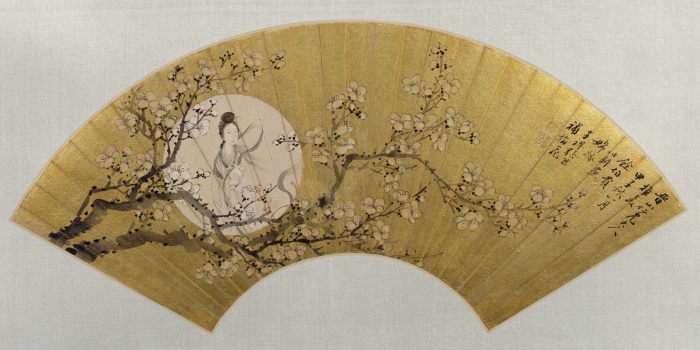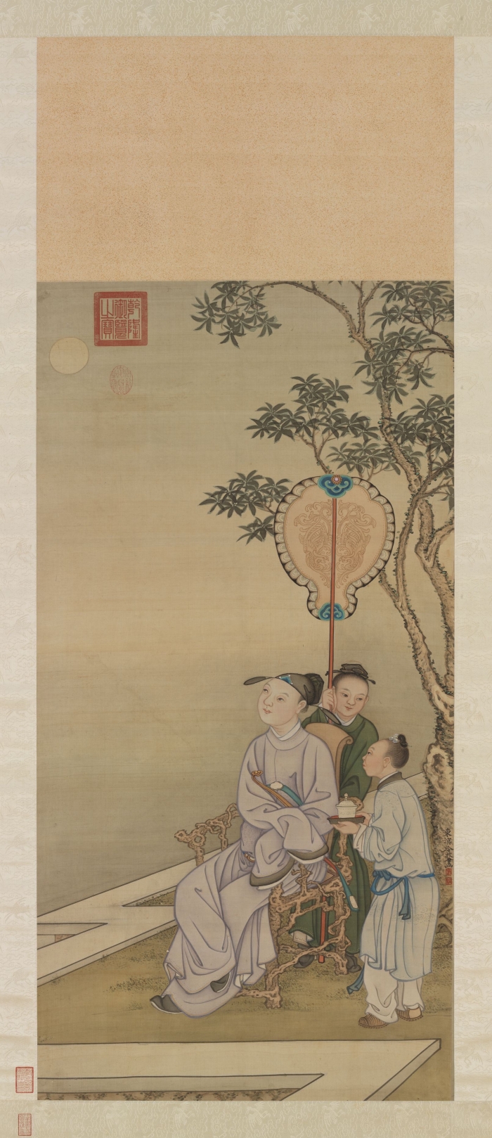 冷枚,字吉臣,康熙(西元一六六二–一七二二)時宮廷畫家,擅長畫人物、山水。農歷八月十五是一年秋季正中,所以稱中秋,是桂花盛開、飄香的季節,此時月光也最為明亮皎潔,是賞月最好時節。中秋賞月在唐代已是約定俗成的傳統節日,有闔家團圓賞月,也有三五好友相聚登樓賦詩,而此幅士人靜坐獨賞清輝明月,別有一番情趣。畫中陰陽明暗的表現,是受到西洋光影技法的影響。