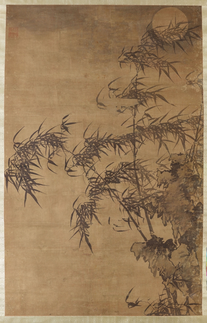 此幅無款,只鈐有”欽賜一樵圖書“一印,此印文是朱端入奉內廷后皇家所賜號。圖中所繪湖石與其畫山水筆法同,墨竹學夏昶,用筆稍縱逸,一輪明月掛竹梢,更顯意境清幽。