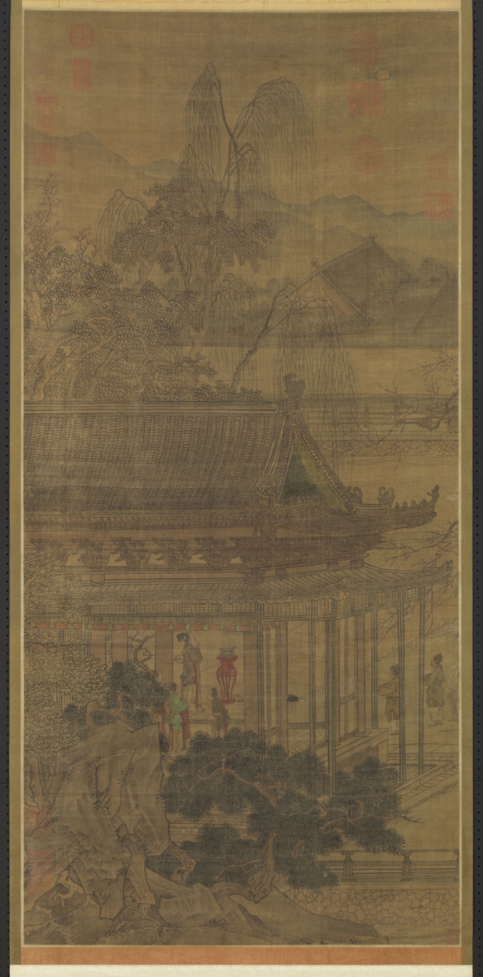 圖繪素月流天,華堂四敞,焚香斂袂,姬侍盈前。堂后樓榭參差,風柳露桃,高下掩映。