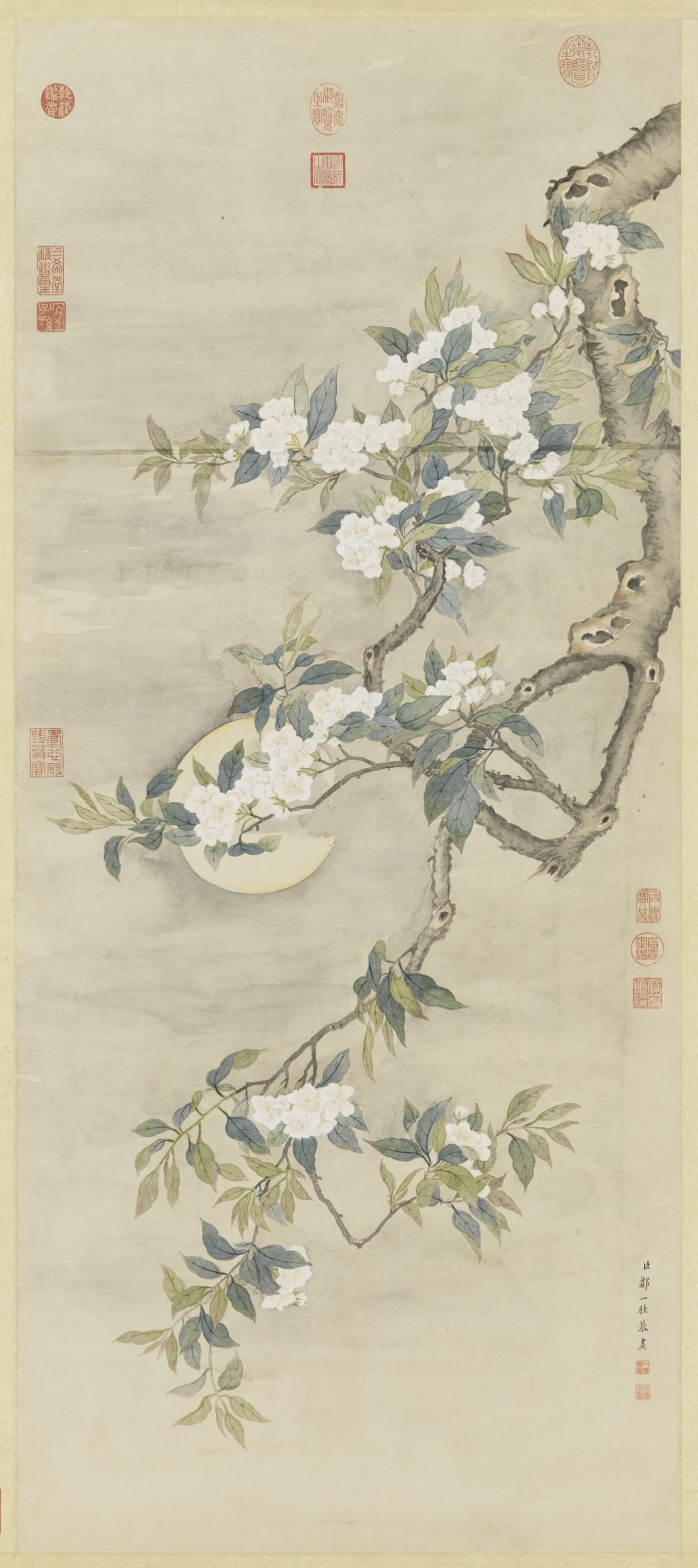 本幅梨花主干由畫幅右上方垂探出枝,條暢自如,布葉生花,曲盡其態,樹后暗影中托出明月一輪,更現梨花明凈韻致。師惲壽平沒骨技法,以色點染花瓣形彩,線條鉤畫葉脈筋絡,然畫風較惲工整精致,別具宮廷品味。