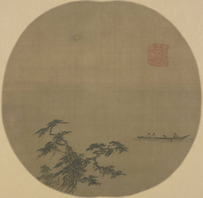 繪月圓之夜江上游船之景,畫面近端幾桿松枝入畫,枝壯葉茂;江面水平如鏡,寬闊無邊;浩月當空,夜空中照亮著江中小舟前行。全圖大部分空白,卻達到了煙波浩淼,水天一色之意境。