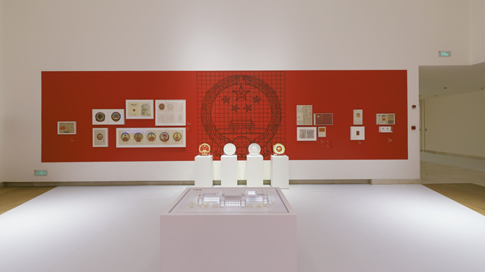 展覽的第一板塊“國家形象與人民敘事”呈現了一系列具有重大象征意義的新中國設計。國旗、國徽的設計秉持全民參與的理念,將國家符號的設計融匯在“人民大團結”的意象中,在新中國成立初期起到了積極廣泛的社會動員作用。