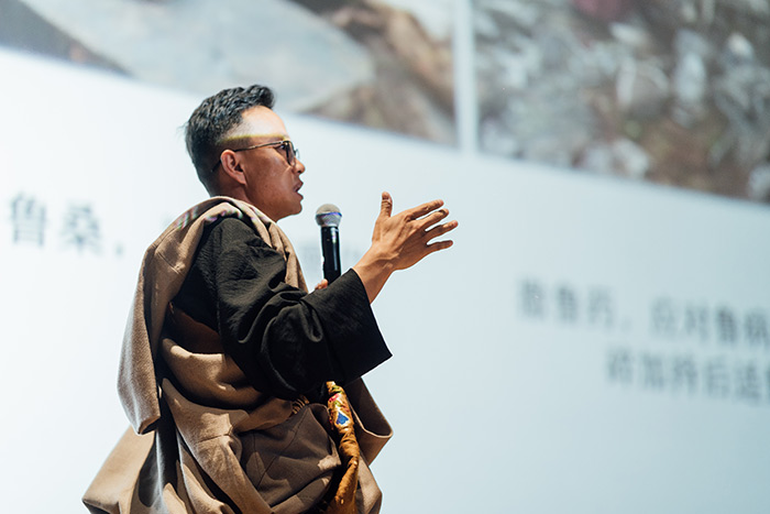 卓巴倉亞洲水源修復推動者、卓巴倉一游牧人書院負責人更求然丁講述了關于“卓巴倉”項目的實踐。青藏高原游牧人家的牧民稱為卓巴,草原上一頂頂的黑色的毛衣帳篷,叫做卓巴倉。如今青藏高原面臨著高寒草原生態系統失衡和青藏高原文明傳承衰微的問題。由于氣候變化和人為影響的加劇,冰川和永久凍土地帶的融化地貌隨之也在發生著變化,水源和濕地不斷干涸,荒漠化地區不斷擴大,“卓巴倉”項目以此為背景開始實踐,最后更求然丁圍繞新型生態牧場水源祭祀、水源修復等具體的工作的內容展開討論并總結。